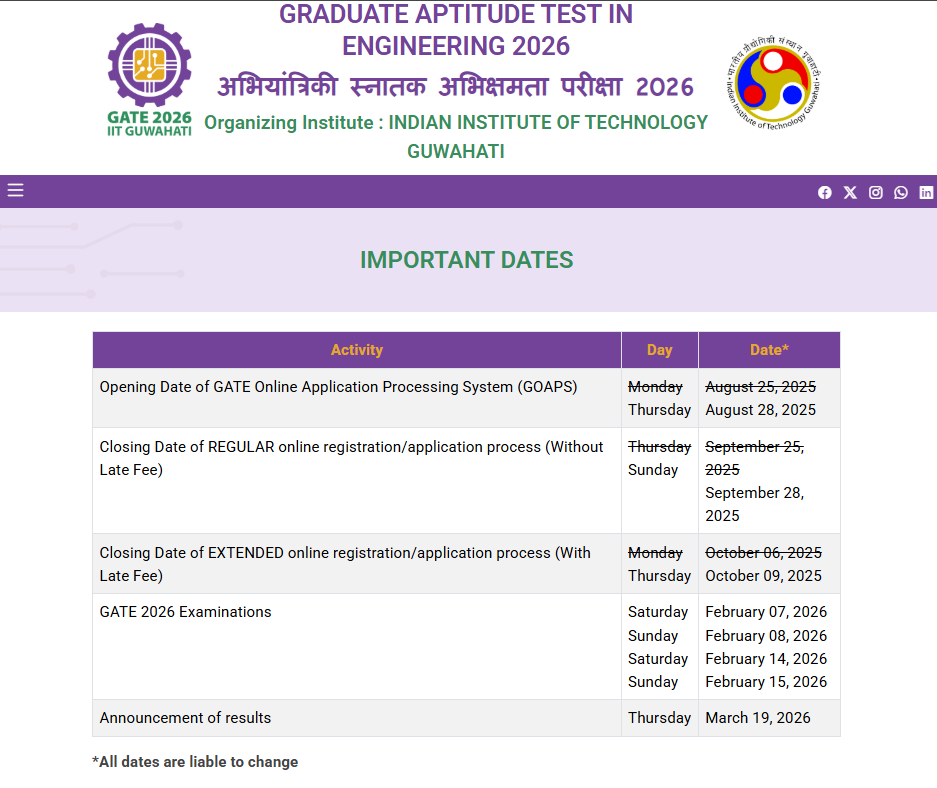 IIT GATE 2026 Online Form(Indian Institute of Technology , IIT Guhawati) Exam Name –Graduate Aptitude Test in Engineering | |||||