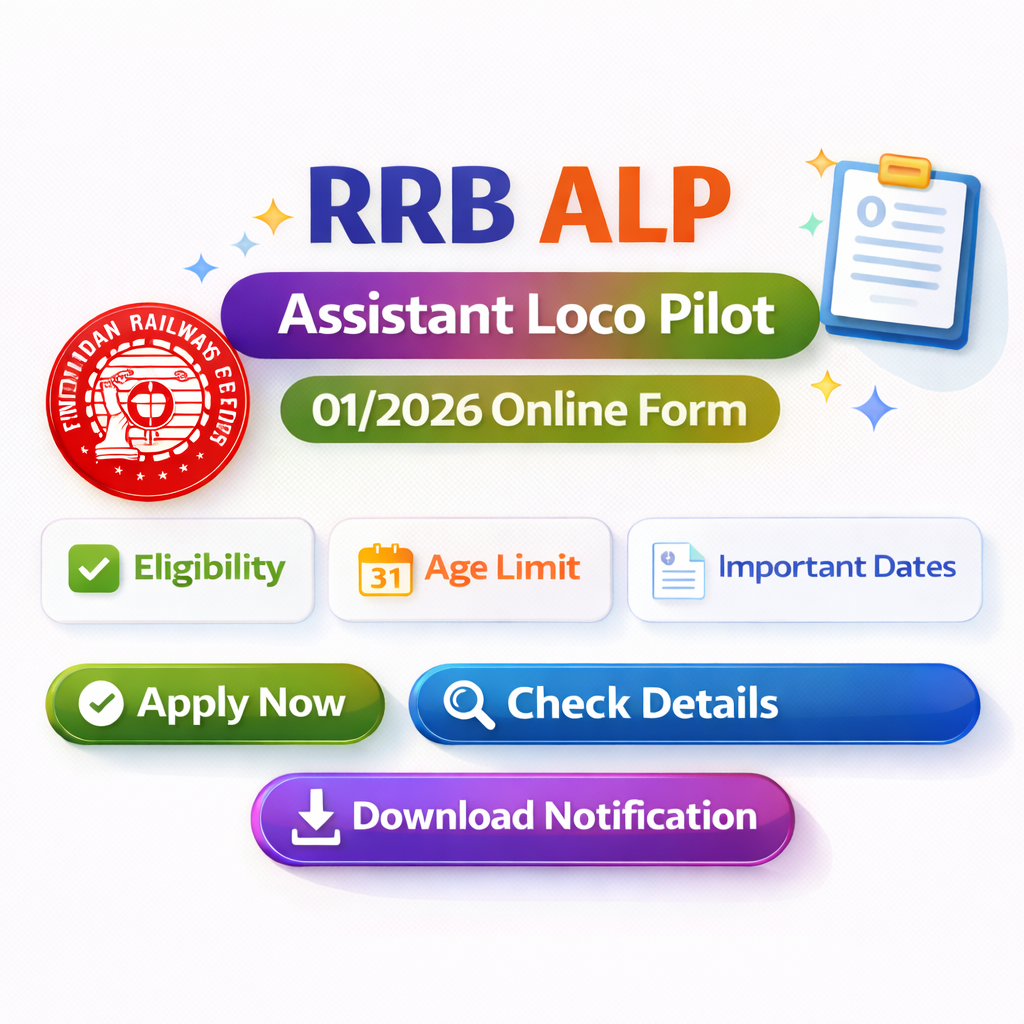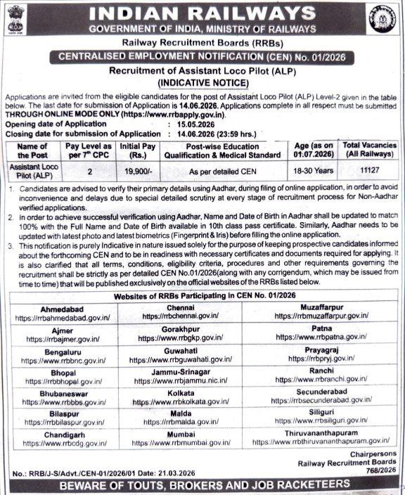 Post Description – The Railway Recruitment Board (RRB) has released an indicative notification for the recruitment of Assistant Loco Pilot (ALP) under CEN 01/2026. A total of 11,127 vacancies will be filled through this recruitment across various railway zones in India. Details Of Recruitment Of RRB ALP Assistant Loco Pilot Online Form 2026Posts Name – Assistant Loco Pilot Number Of Posts – 11,127 Posts Pay Scale – Level 2 (₹19,900/- Starting Salary) Education Qualification – How to Apply Online RRB ALP Assistant Loco Pilot Online Form 2026 – Candidates can apply through link provided below or they can also apply through official website before 14 June 2026. Required Documents For Online Application – Educational Marksheet And Certificates Aadhar Card / Pan Card Passport Size Photo Signature Selection Mode – CBT 1 Exam CBT 2 Exam Computer Based Aptitude Test Document Verification Medical Examination Final Merit List | |||||