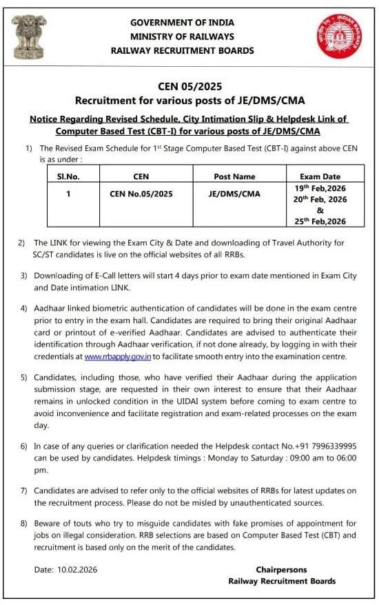 IMPORTANT DATESExam Date – 19-20, 25 February 2026 Admit Card – Before 48 Hours Of Exam Answer Key – 05-03-2026 Application Status- Before 10 days Of Exam | VACANCY DETAILSExam Name – RRB Railway JE CEN 05/2025 Online Form Total Vacancy – 2569 Posts | ||||