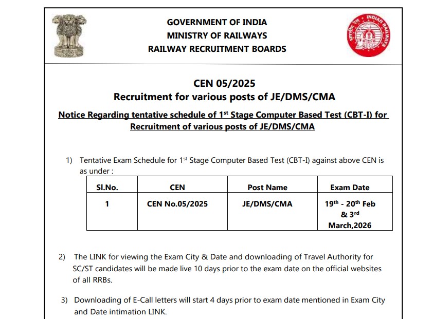 Post Description : Government Of India , Ministry Of Railways Has Been Released Exam Date For RRB Junior Engineer CEN- 05/2025 Online Form 2025. Which Exam Date Is 19th – 20th Feb & 3rd March,2026 Interested People Download Admit card With Using Your Roll No & DOB . Instructions for Downloading the RRB Junior Engineer CEN- 05/2025 Admit Card : 1. In order to download their RRB Junior Engineer 05/2025 Online Form candidates are required to go to the important link section provided below. 2. After getting the link candidates need to click it for downloading their RRB ALP Junior Engineer 05/2025 Admit Card. 3. Candidates need to provide their following details-: Registration No. /Roll No. DOB/Password Captcha Code(if specified) 4. After providing their details appropriately candidates will be able to download their RRB ALP Junior Engineer 05/2025 Admit Card. 5.Candidates can also download their Admit Card from official site of the RRB. | |||||