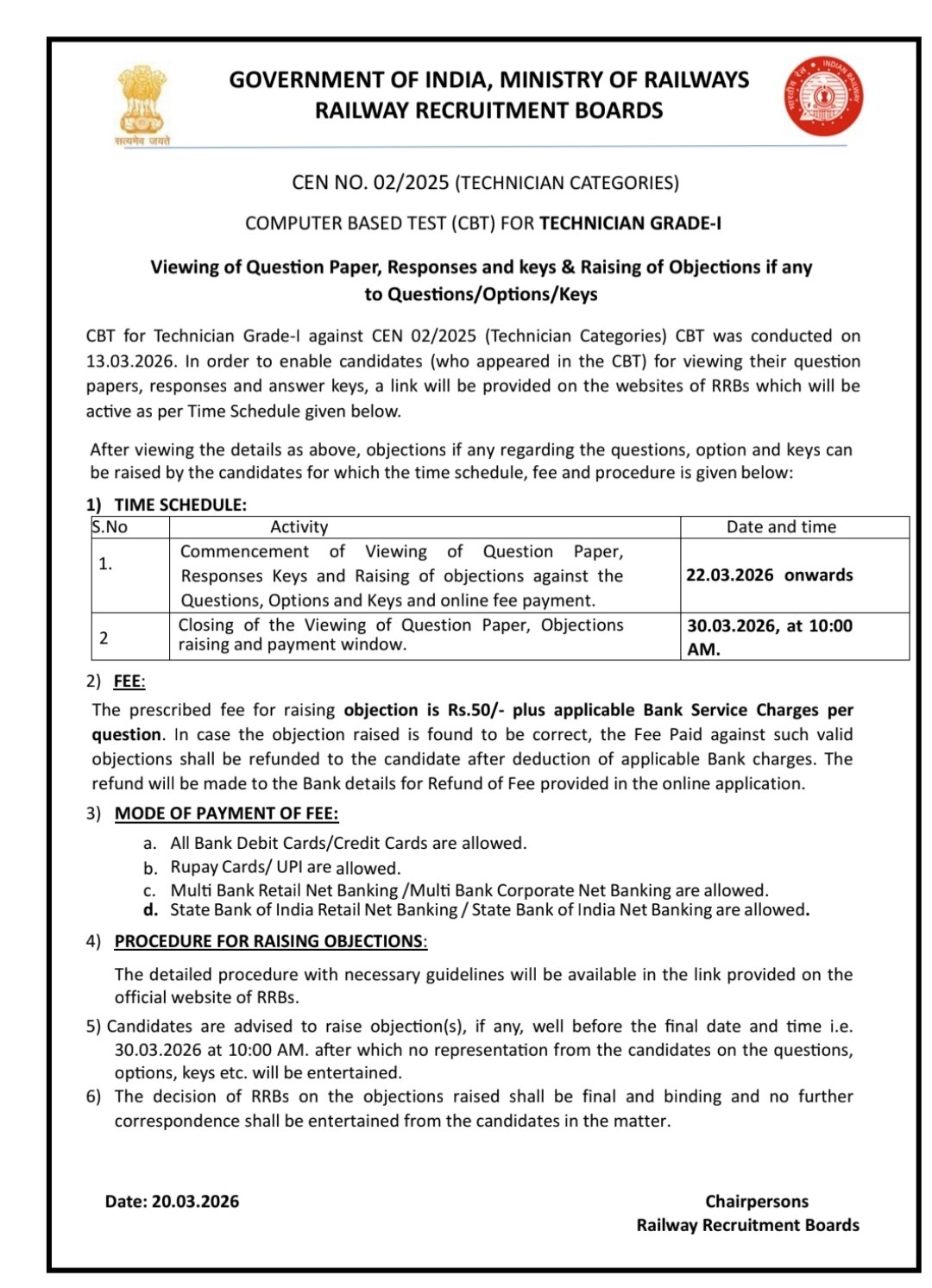 IMPORTANT DATESExam Date – 06-10 March 2026 Application Status – Notify Later Admit Card – Before 4 Days Of Exam Answer Key – 27-03-2026 | VACANCY DETAILSExam Name – RRB Railway Technician 02/2025 Online Form Total Vacancy – 6238 Posts | ||||