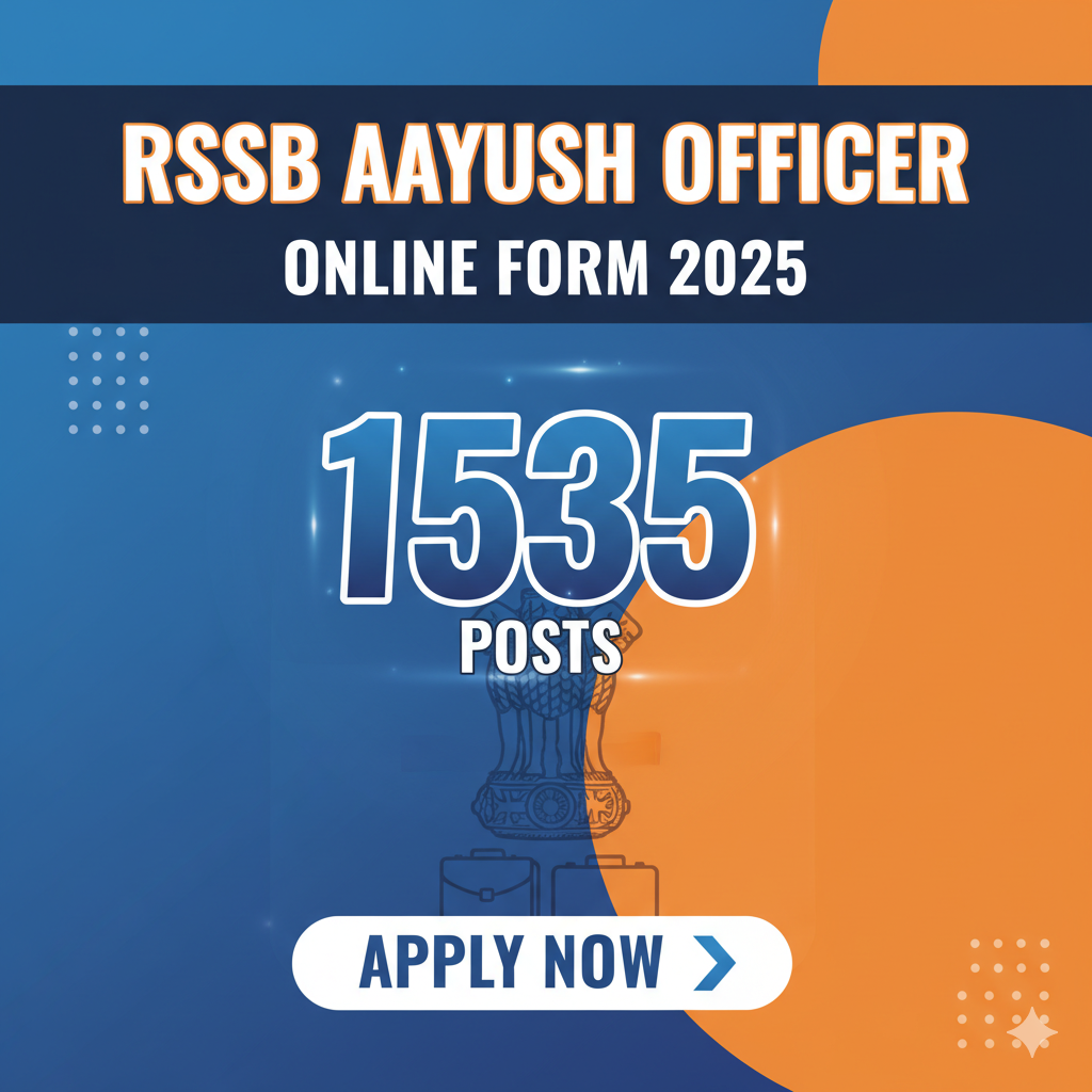 Post Description – RSSB Rajasthan Staff Selection Board is inviting online applications for the post of Aayush Officer for 1535 posts. Interested candidates who meet all the eligibility criteria can apply online. Details Of Recruitment Of RSSB Aayush Officer Online Form 2025Posts Name – Aayush Officer Number Of Posts – 1535 Posts Category Wise Posts – For Non – TSP Area – 1340 Posts For TSP Area – 195 Posts Pay Scale – As Per Rules Education Qualification – BAMS / BHMS / BUMS degree from a recognized Indian university (as per Rajasthan Homoeopathic Medicine Act, 1969) and registered with the respective Rajasthan medical board (Ayurvedic/Homeopathic/Unani). How to Apply Online RSSB Aayush Officer Online Form 2025 – Candidates can apply through link provided below or they can also apply through official site of the Rajasthan Staff Selection Board before 08/November/2025. Required Documents For Online Application – Educational Mark sheet And Certificates Aadhar Card / Pan Card Passport Size Photo Signature Selection Mode – Written Exam Merit List